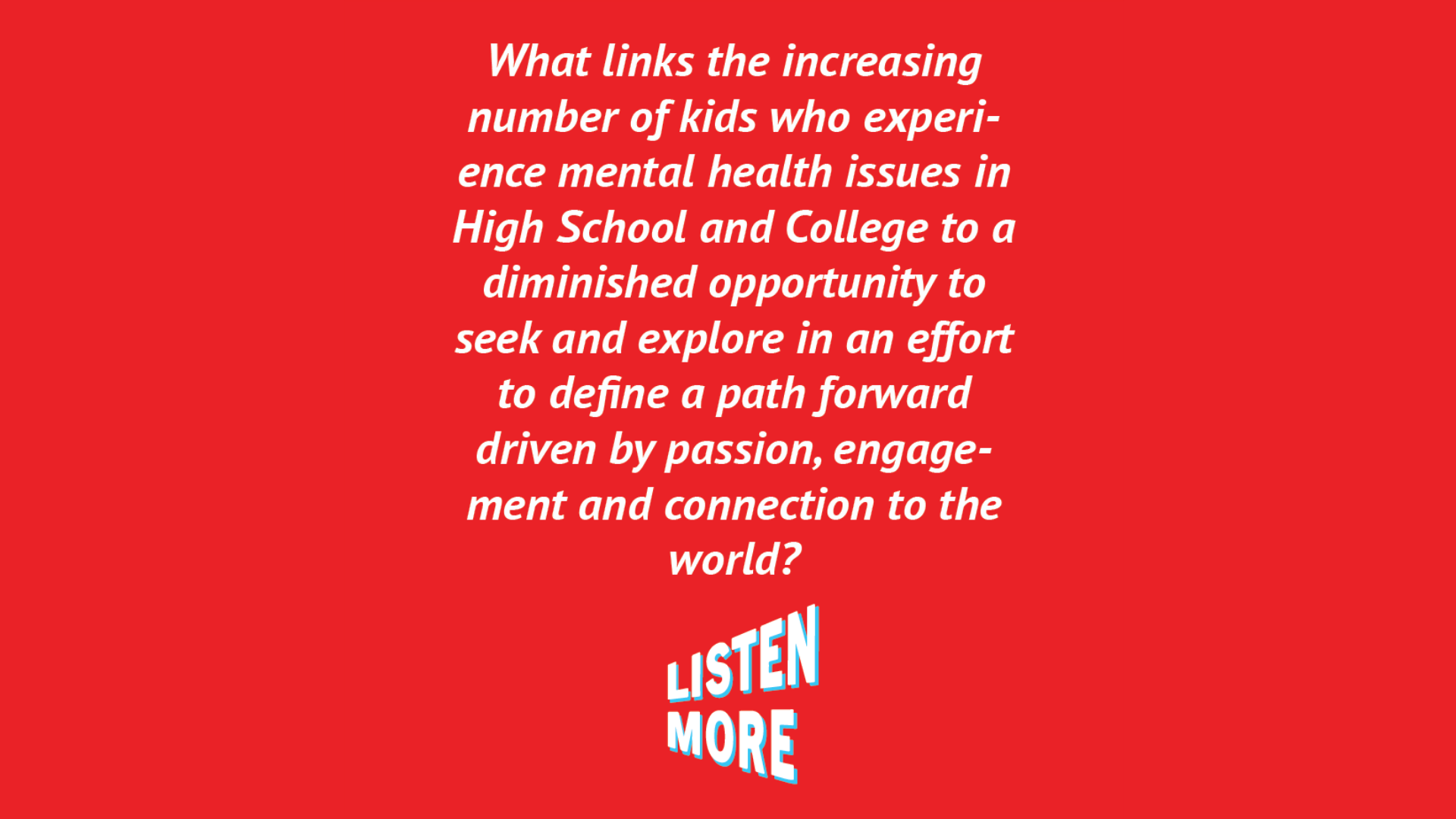 The kids talk about how they define success and how society has defined success FOR them-and whether or not the two go together. These definitions-and the inherent anxieties that accompany them-seem to be handed over to our kids at an increasingly early age-maybe 5th or 6th grade. The louder the drumbeat becomes, the more difficult it is for them to spend the time and the effort on activities (or LACK of activities) that might truly enable them to discover themselves, their passions, their interests and the qualities and values that truly define long-term life satisfaction.